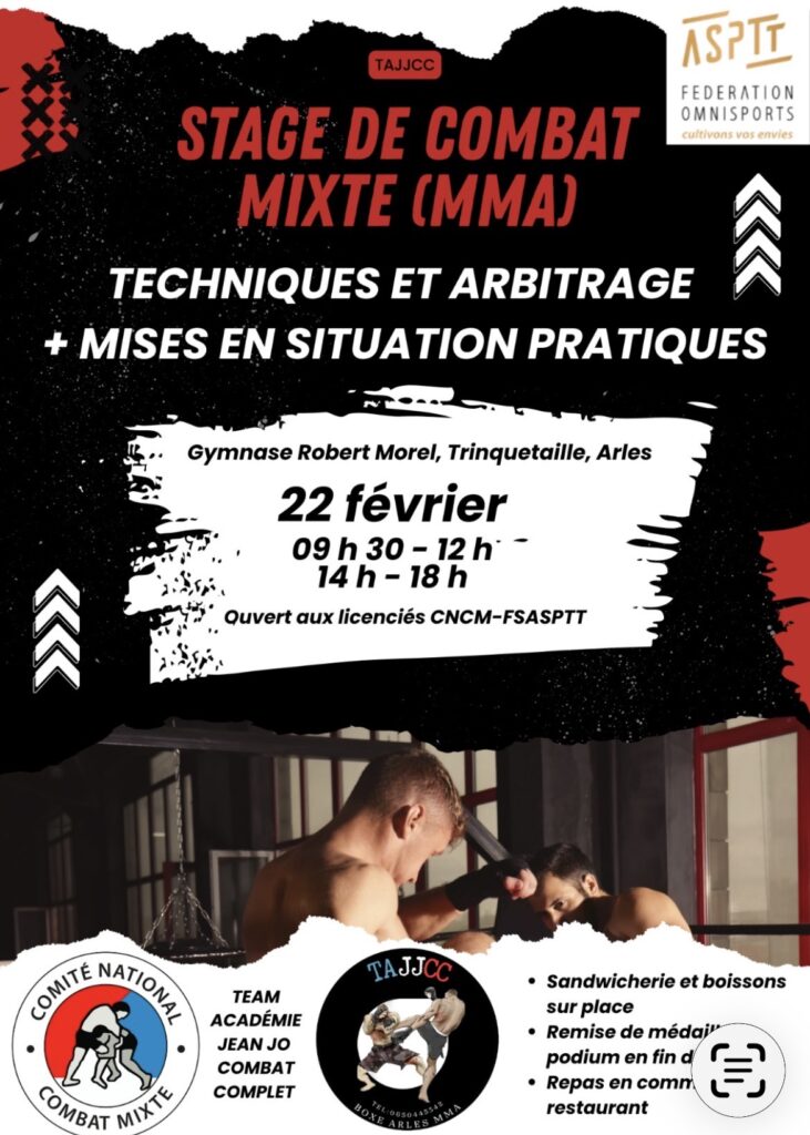 Stage de Combat Mixte (MMA) le 22 février à Arles ouvert aux licenciés CNCM-FSASPTT 03/02/2026 vie fédérale Aucun commentaire Au menu : stage technique, réglementation sportive et mise en situation avec sparring éducatif pour tous niveaux et âges. Renseignements : 0651267330 « Previous Post Affilier son club au CNCM